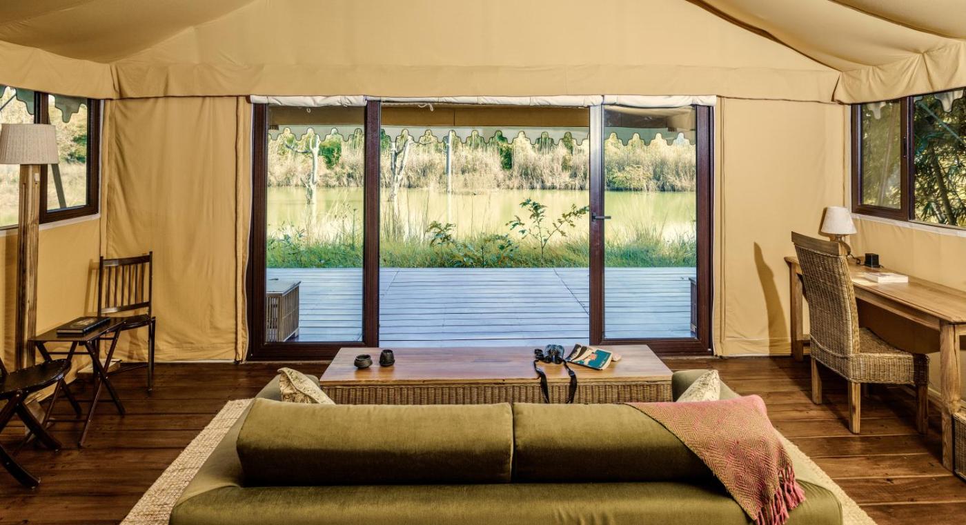 Tented Suite. The tent provides air conditioning, a private entrance, a balcony with lake views as well as a private bathroom featuring a shower. The unit offers 1 bed. ;
